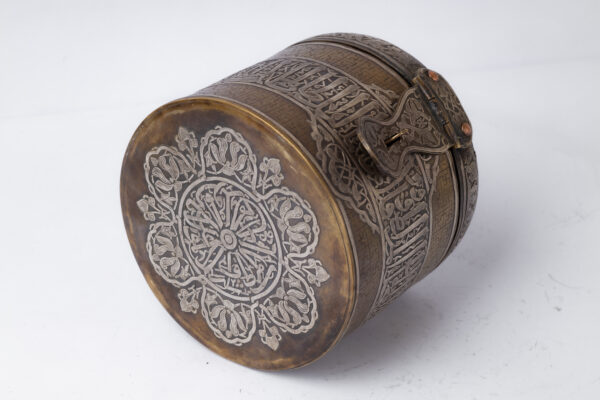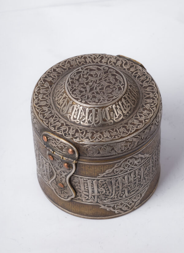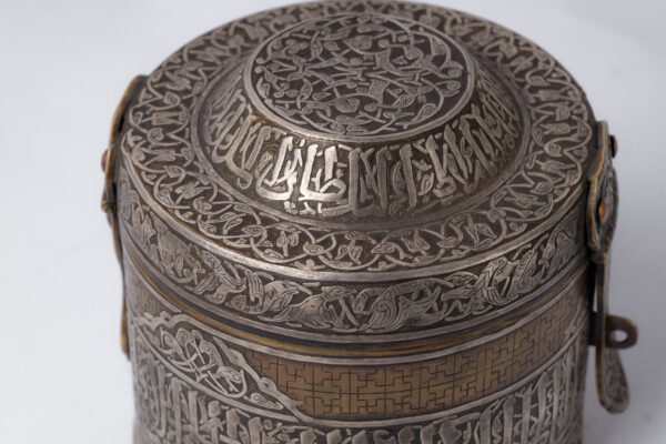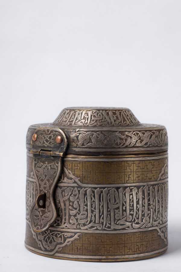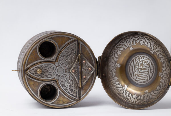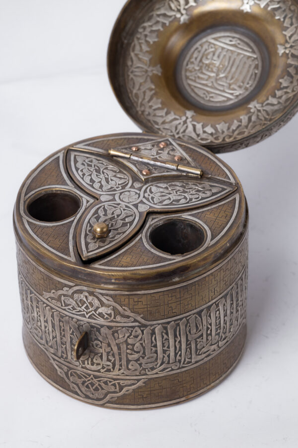 An inkwell inspired by the Mamluk era, belonging to Sultan Qalawun, made of brass inlaid and engraved with silver. It consists of a body, a lid and a lock.