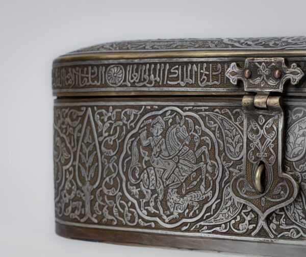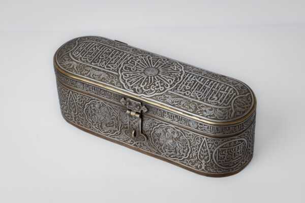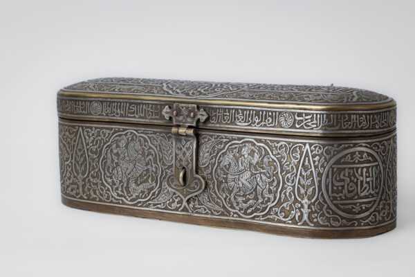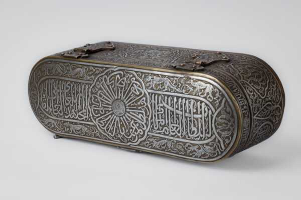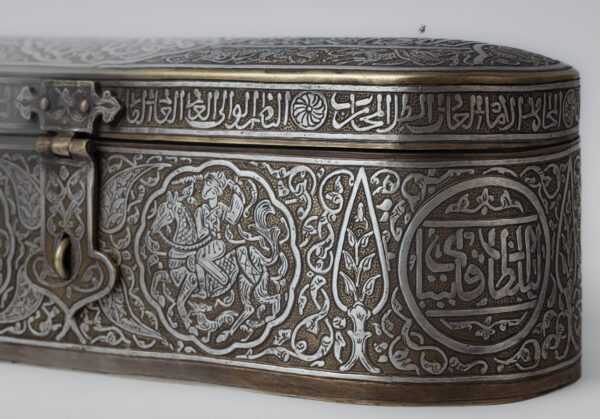 The cover is adorned with a band of Mamluk script bearing the titles of the Sultan. On the face of the lid, there is a circle with the Sultan’s titles, surrounded by predatory animals. There are also cartouches inside with Mamluk script.
