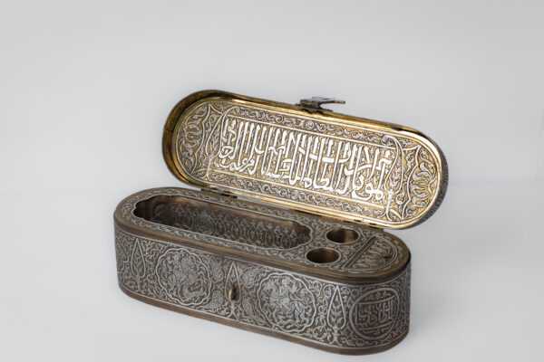 On the inner face of the lid, there is a cartouche in Mamluk script, surrounded by leaf motifs. Inside, there are four openings for ink and quills: two are surrounded by leaf motifs and the larger opening at the bottom is adorned with a lion and a gazelle.