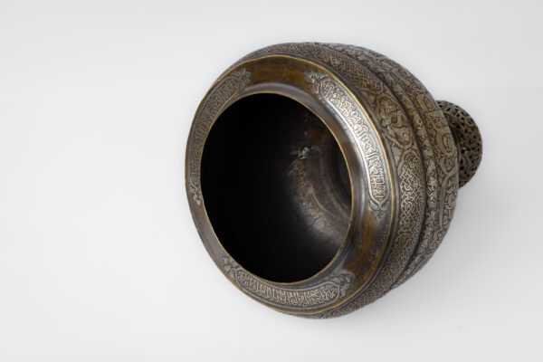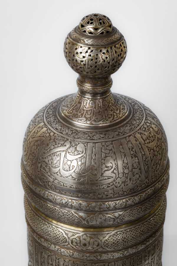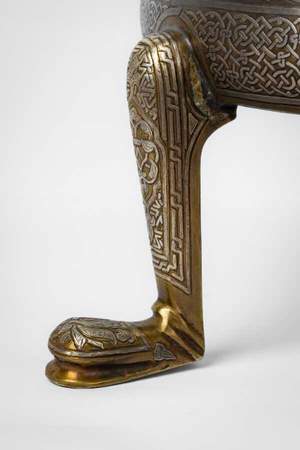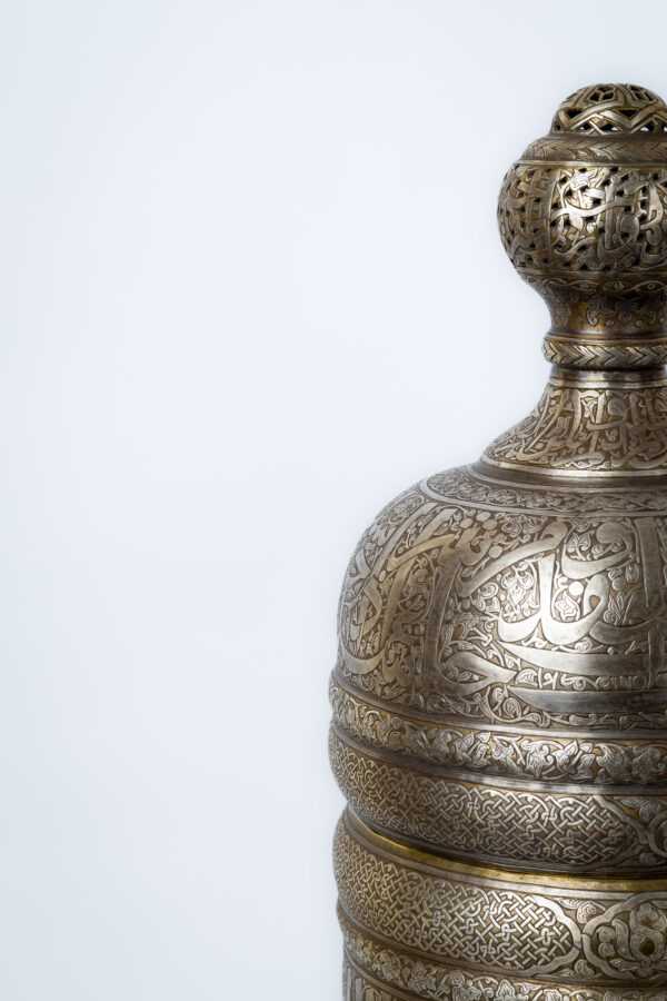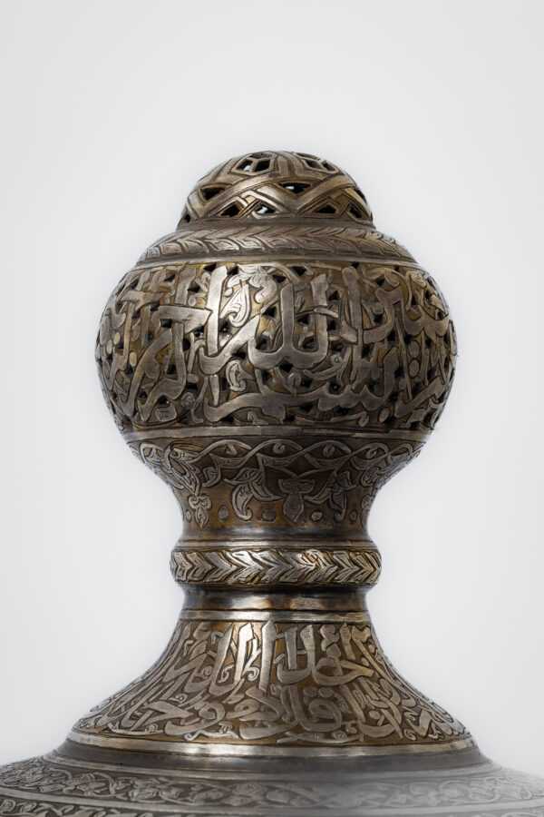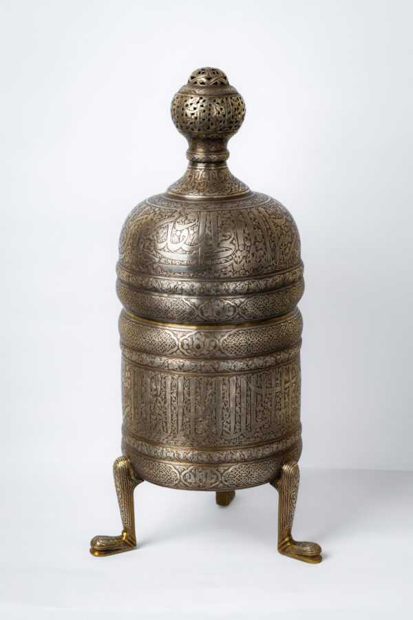 An incense burner made of brass inlaid and engraved with silver, inspired by the Ottoman era during the reign of Sultan Suleiman the Magnificent. It consists of a body with three legs and a dome.