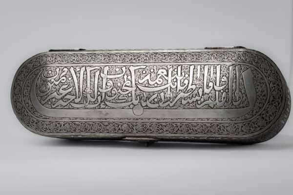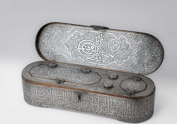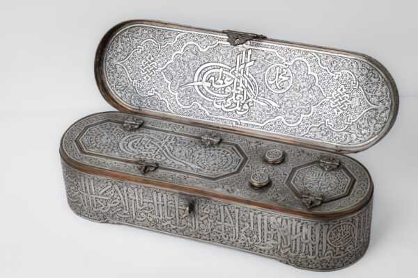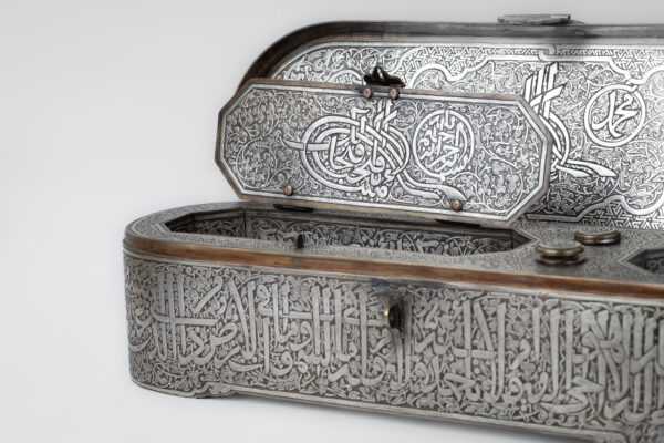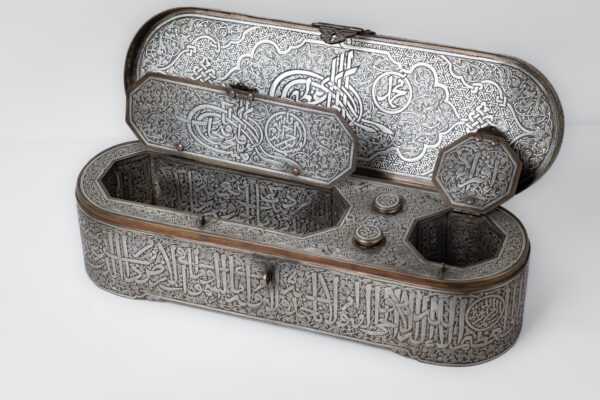 The inkwell has four openings for ink and quills: two with a lid and two with small domes. The small domes are inscribed with: “Ya Hannan Ya Mannan” (O Most Compassionate, O Most Gracious).