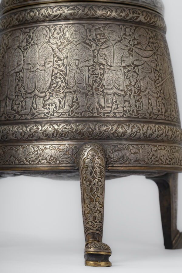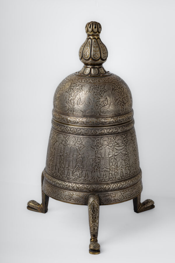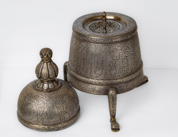 An incense burner made of brass inlaid and engraved with silver, inspired by the Seljuk era during the reign of Sultan Ahmad Sanjar, son of Malik Shah, son of Muhammad Alb Arslan. The incense burner portrays a hunting journey. It consists of a body with three legs and a dome.